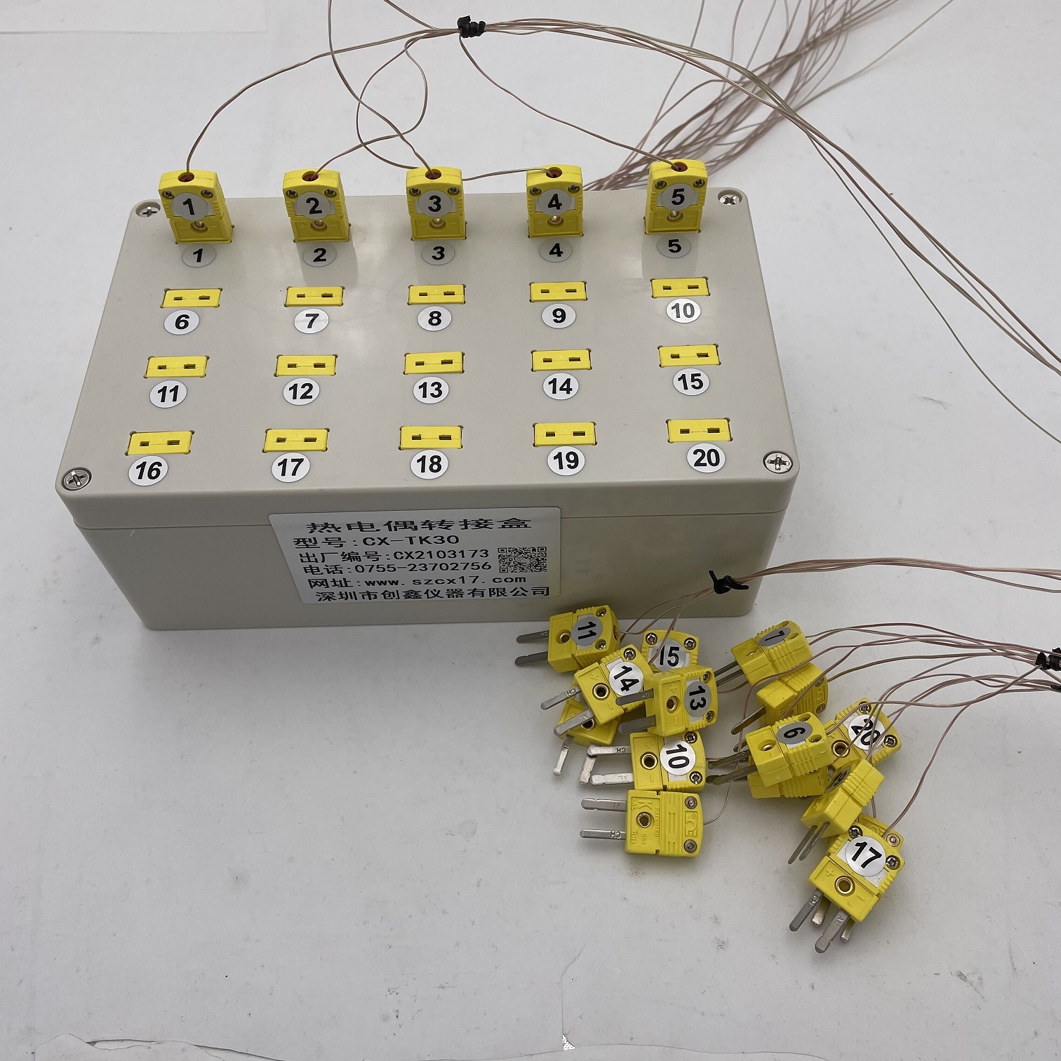 3、 熱電偶轉(zhuǎn)接盒:為了在試驗(yàn)中,避免熱電偶布線時(shí)的不便,特別設(shè)計(jì)的熱電偶專用轉(zhuǎn)接盒,上面有熱電偶專用的轉(zhuǎn)接插頭和插座(可根據(jù)熱電偶類型分為K、J、T型等),外表為鋁合金或不銹鋼盒體,每路熱電偶均編號(hào)。方便熱電偶在被測件及記錄儀之間的轉(zhuǎn)接和布線。