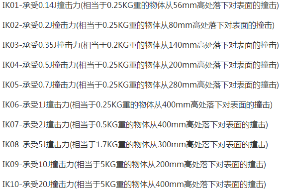 2、在iec62262防護等級代碼中,ik代碼表示外殼對外界有害機械碰撞的防護等級,特征數(shù)字組合為:01到10,即:iko1,ik02,ik03,ik04,ik05,ik06,ik07,ik08,ik09和ik10。在這10個等級中根據(jù)不同等級測試水平分為兩組測試:組是從ik01,ik02到ik06的彈簧沖擊錘測試,這一組測試的能量較小(從0.14j到1j);另外一組是從ik07,ik08到ik10的大擺錘測試,其測試的能量較大(從2j到20j不等)。